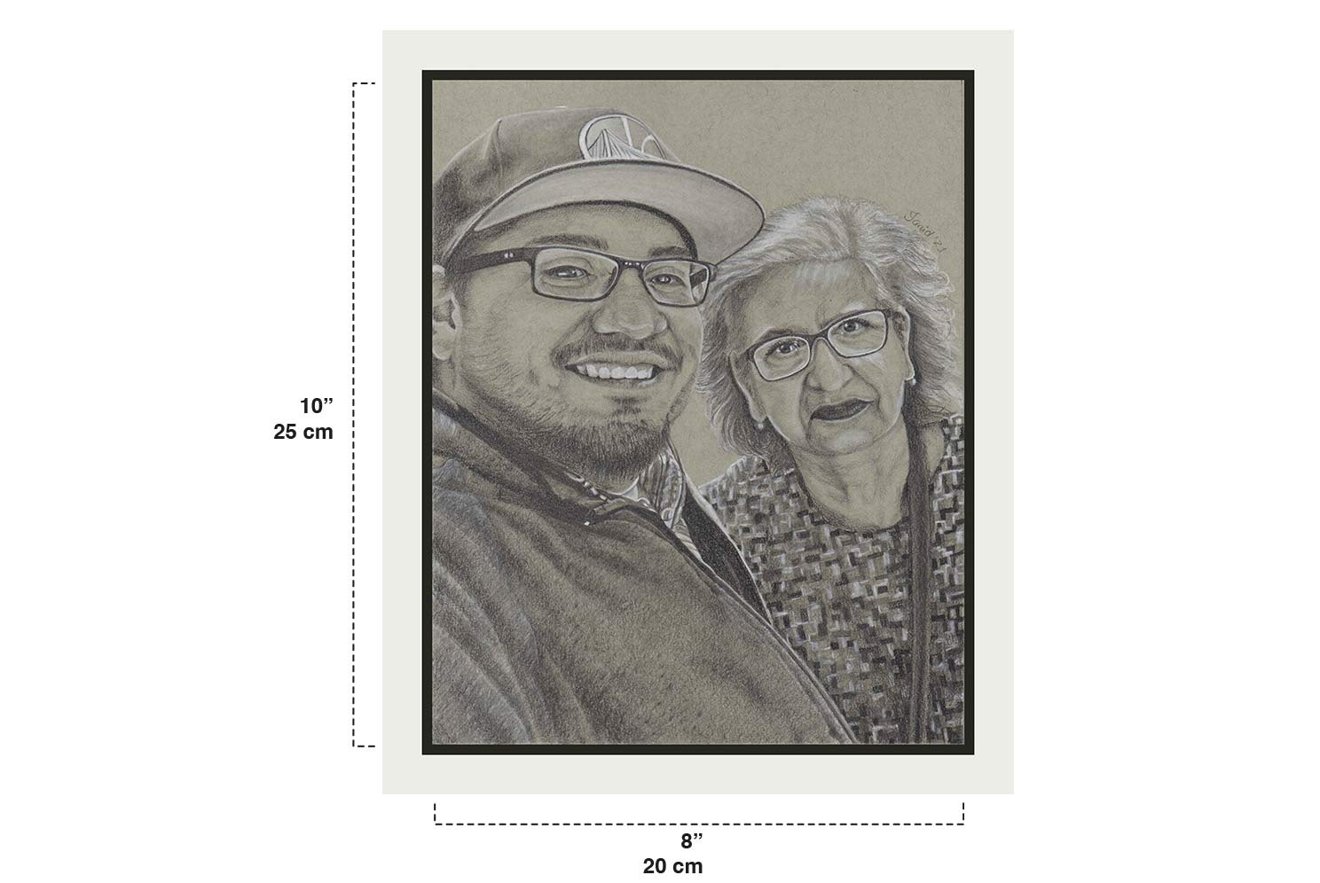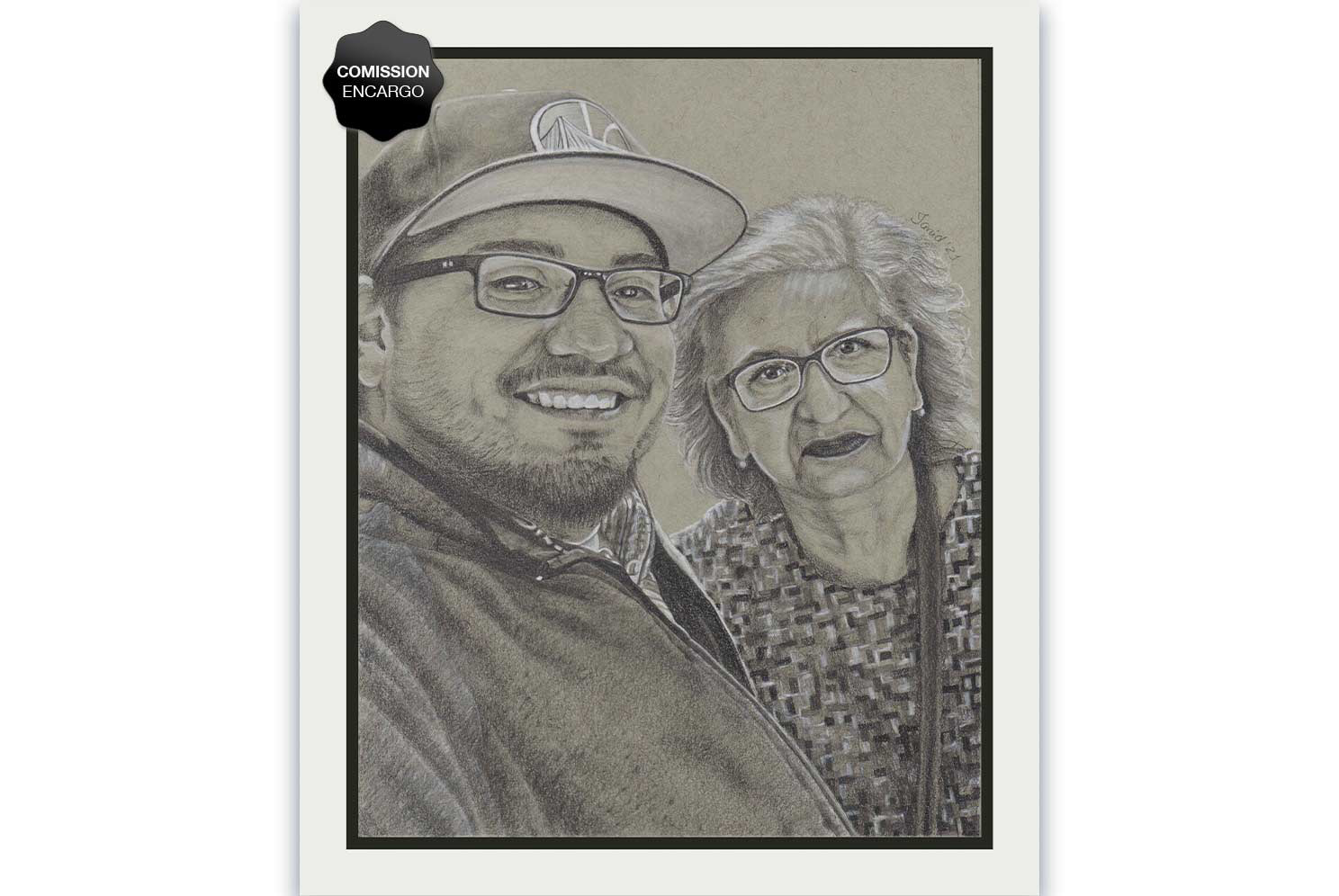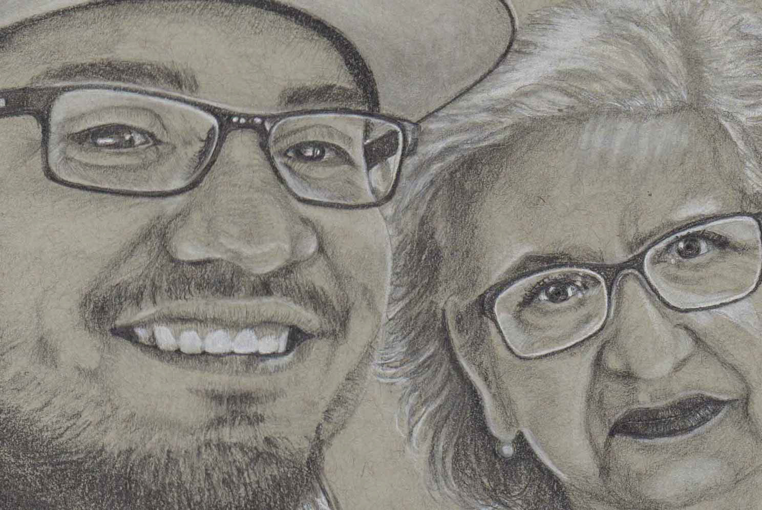 Lápices de grafito y pastel blanco sobre papel tonal gris.