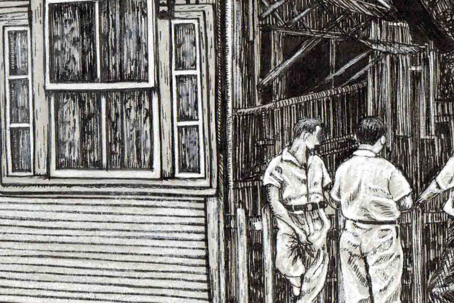 Plumilla y lápices pastel sobre papel tonal gris.